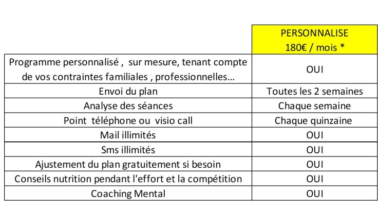 Bref, c’est un suivi personnalisé. Vous serez coaché jusqu’au jour J, avec des conseils pour gérer votre course et également un focus sur le mental et sur la nutrition course , la 4ème discipline !